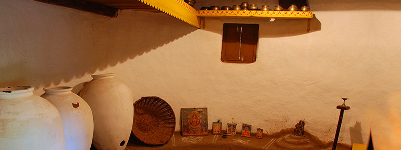 The walls of the house are built in mud using the cob wall technique i.e. earth is mixed with water thoroughly to form the right consistency. Then, balls of mud are placed closely in a row and the wall is built up from there. In one day, only 2 feet of wall may be erected. It is allowed to dry, before the next 2 feet is built on the following day. Palmyra timber is used for rafters, palmyra thatch for the roof, and lime wash for the walls. There is an inner flat mud and timber roof above the inner room to provide extra protection from rain and fire. It is important that the slope of the roof be a minimum 45 degrees. A slope less than that causes water to fall through the palm thatch leaves. The roof overhang protects the mud walls from the rain. Because of the need for such an overhang, the roof almost touches the ground around the house. The door is very low and made out of locally available timber.